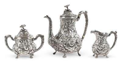 Comprising a teapot, creamer and covered sugar, baluster form heavily repoussé-worked and chased to depict flowerheads and foliage on a stippled ground, lids with flower finial, raised on scroll feet. (3).