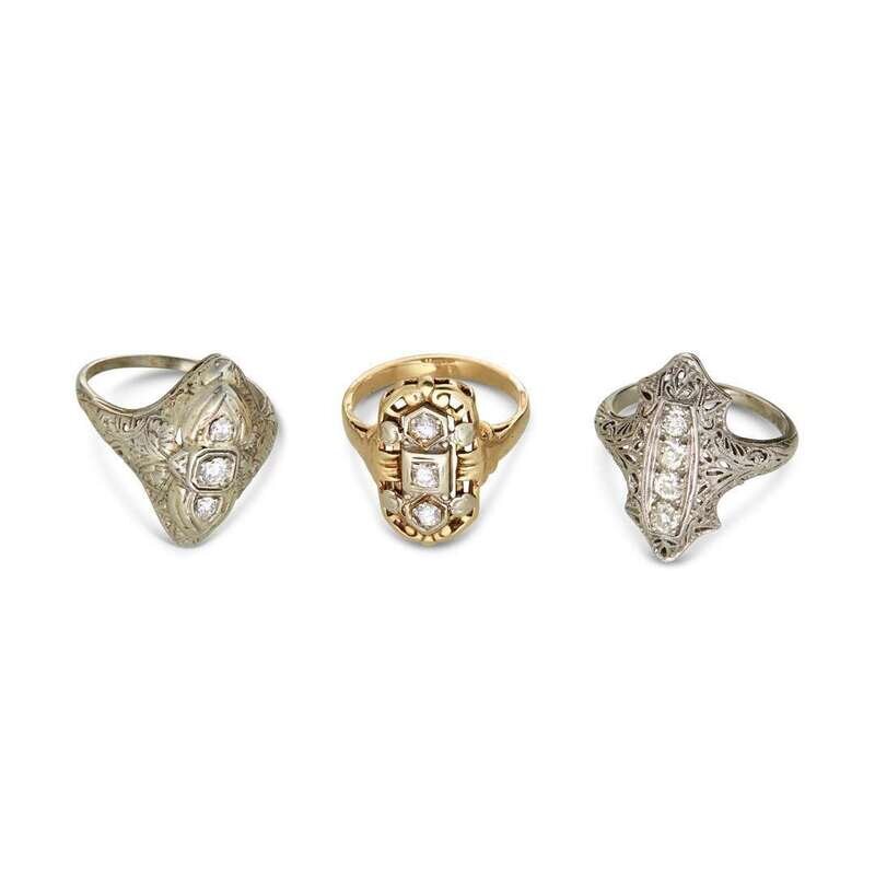 A collection of three diamond, eighteen and fourteen karat gold filigree rings early twentieth century