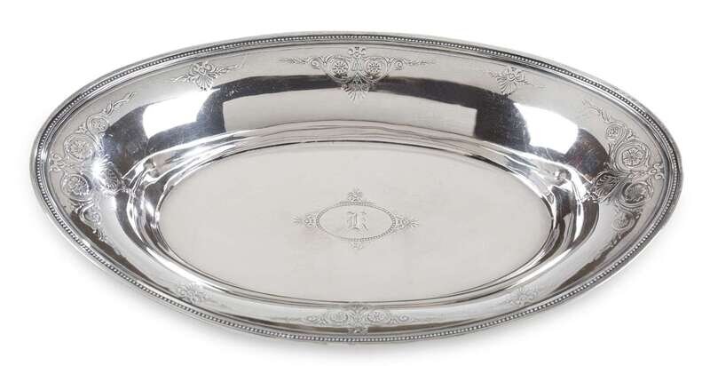 Oval shape with beaded rim, flower head, shell and vine relief with monogrammed "K" medallion in bowl.