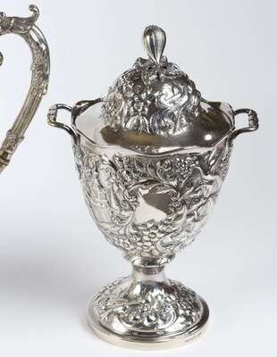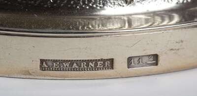Comprising a teapot, coffee pot, waste bowl, creamer and lidded sugar bowl, each vasiform piece with architectural and floral repousse, empty cartouche, marked A.E. Warner and 11 2 in rectangles on foot rim. (5).