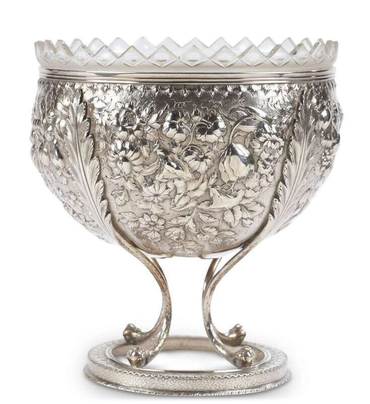 Hand chased floral repousse with four large acanthus leaves ending in claw and ball feet on a ring base, marked, "S. Kirk & Son" and "11 oz", crystal insert later addition.
