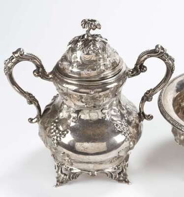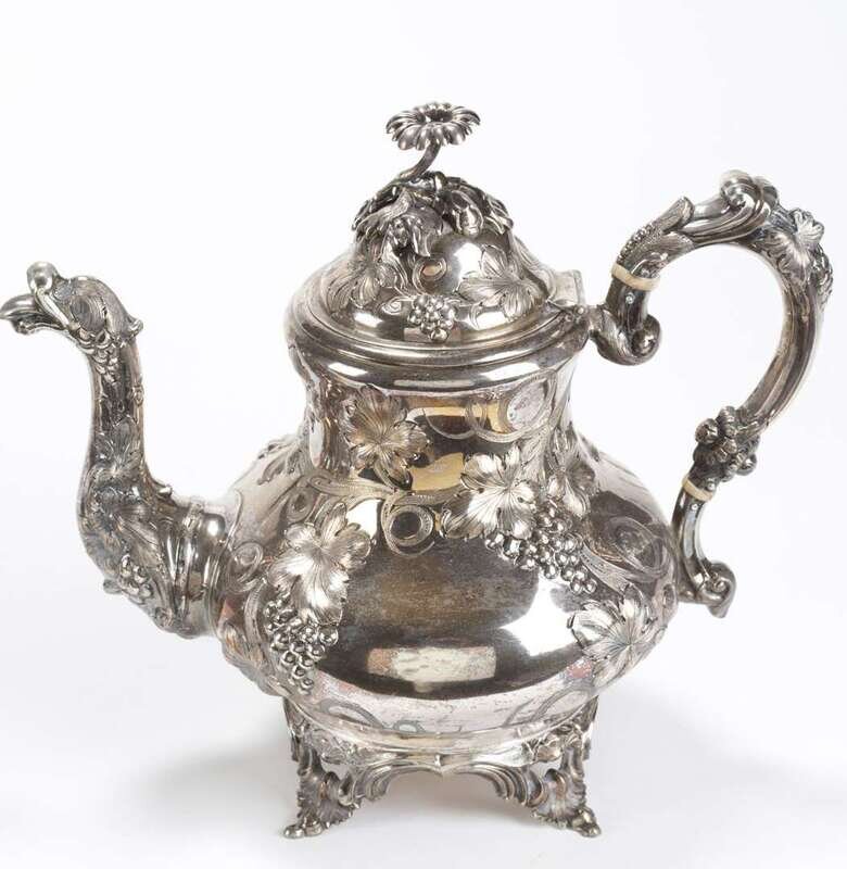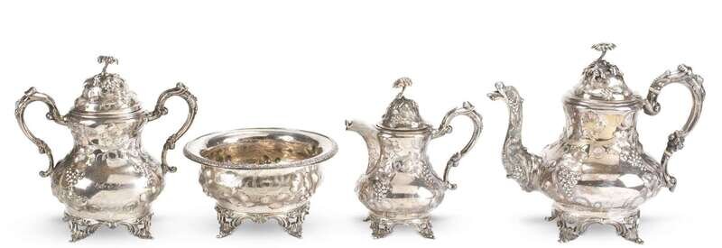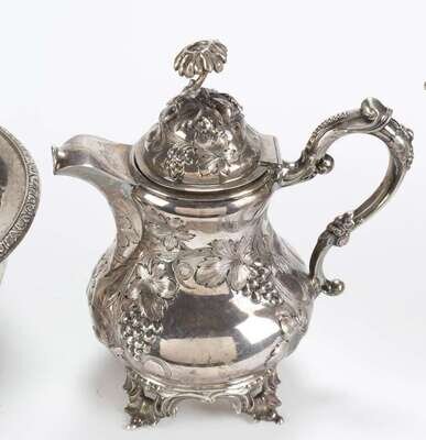 Including teapot, coffee pot, covered sugar and waste pot, floral finial with incised grape leaf, vine and clusters on the body, teapot with figural spout. (4).