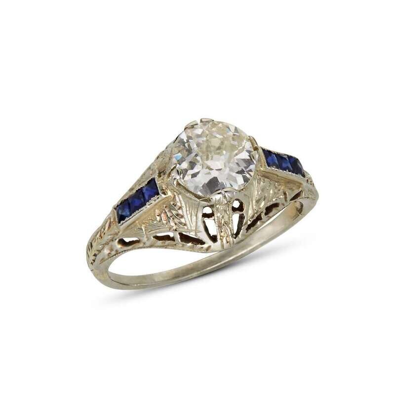 centering one old European-cut diamond, weighing approximately 0.75 carat, flanked by square-cut sapphires.