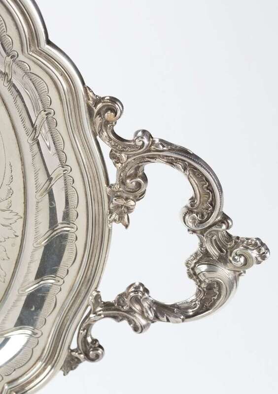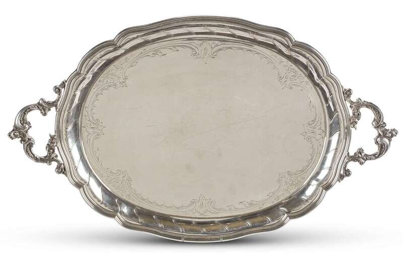 The oval tray with incised c-scroll and floral tray, scalloped rim and ornate c-scroll handles.