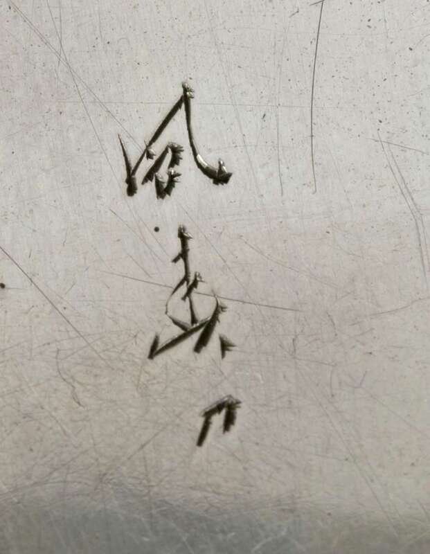 Unidentified maker's mark, hand-chased mountain and village scene.
