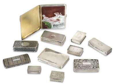 Assortment of eleven snuff boxes and a cigarette case 19th/20th century
