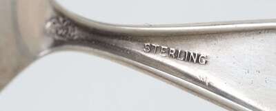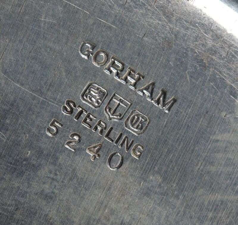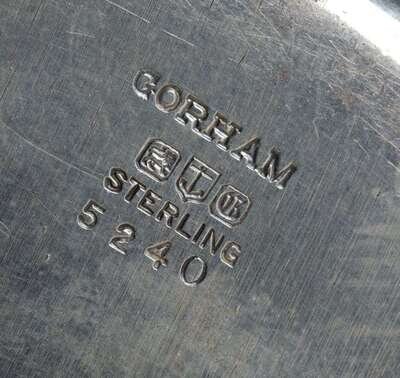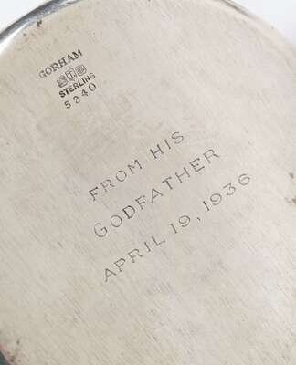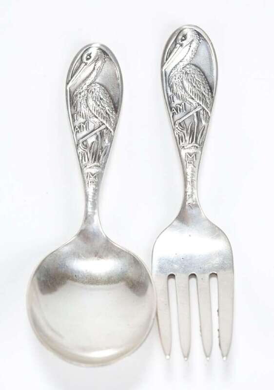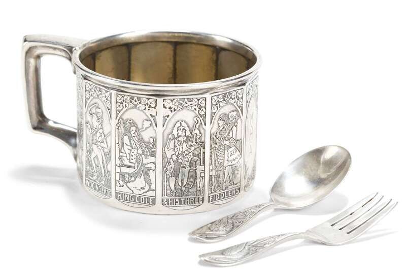 Comprising Gorham Manufacturing Co., Providence, Rhode Island, ca. 1900 christening cup, panels of nursery rhymes, "King Cole" and "Frog Went-A Courting / Wooing Frog." one panel with initials, engraved on base and child's spoon and fork with stork relief. (3).