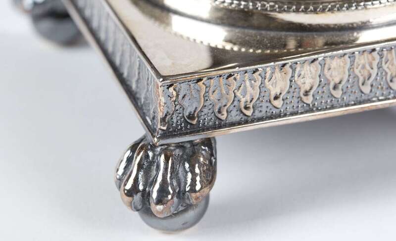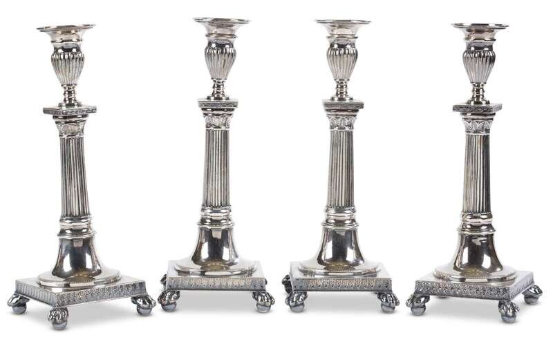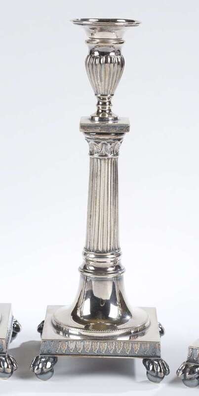 Plated white metal / hvit metall, reeded urn form bobeche, column stem, square base resting on paw and ball feet. (4).
