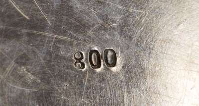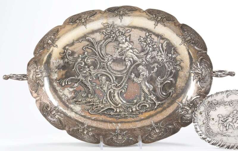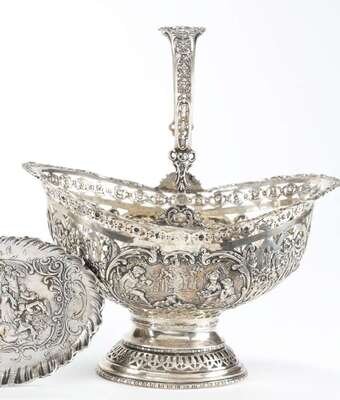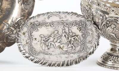 All depicting hand-chased central landscapes of figural gatherings accented by cherubs and/or scroll and bow flourishes., basket marked .800 (3).