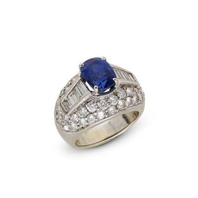 centering one oval sapphire, weighing approximately 3.65 carats, accented by round brilliant and baguette-cut diamonds; estimated total diamond weight: 2.35 carats.