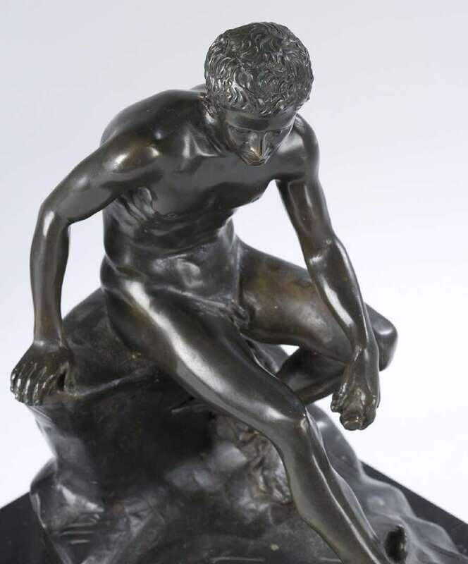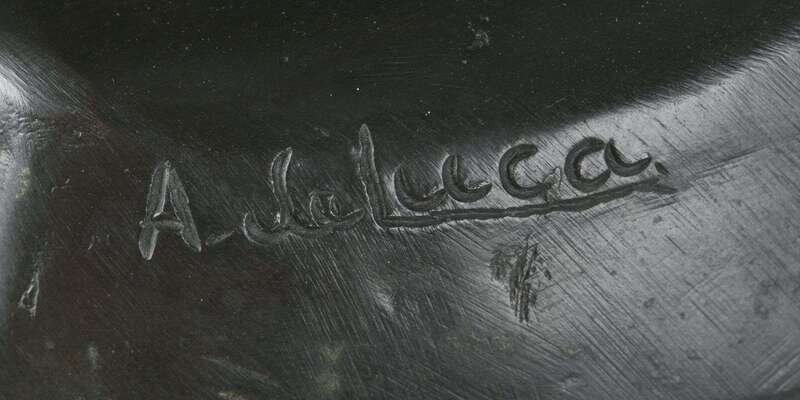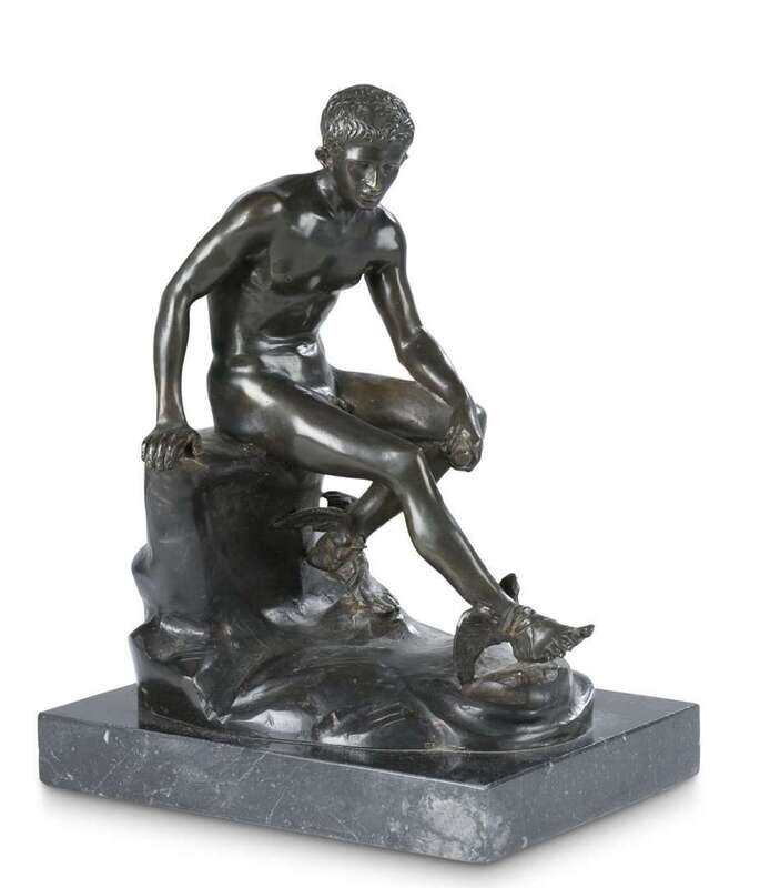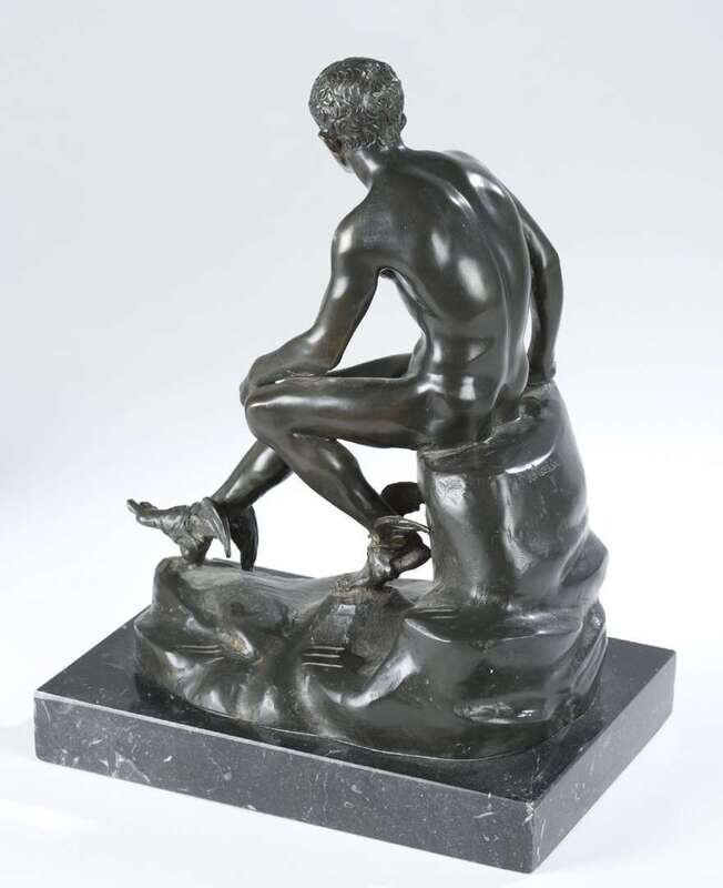 Bronze, brown patina, Hermes with wings on his ankles seated on a stone, signed in cast, "A. de luca."