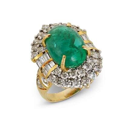centering one cabochon emerald, weighing approximatey 7.25 carats, accented by round brilliant and baguette-cut diamonds; estimated total diamond weight: 2.55 carats.