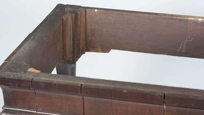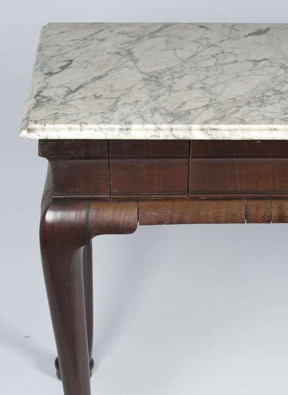 The slab marble top with molded overhang top, walnut veneered base resting on cabriole legs terminating on pad feet.