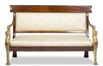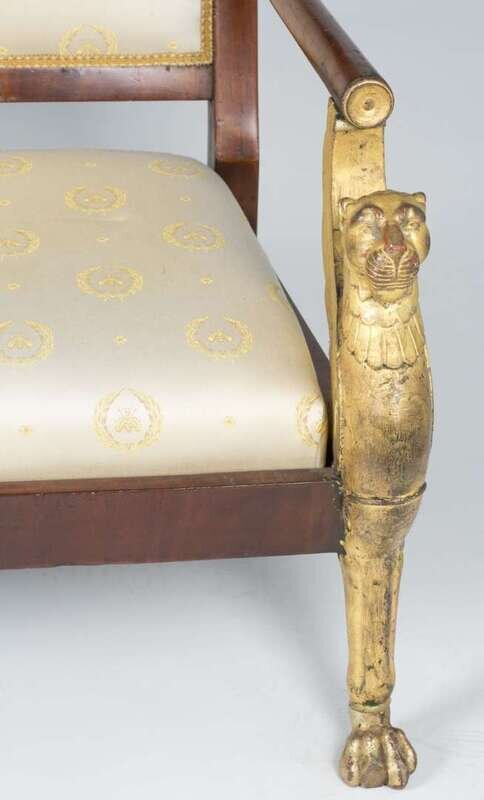 The square back with ebonized border and gilt accents, cylindrical arms rest on lion form front legs, upholstered in Scalamandre fabric.