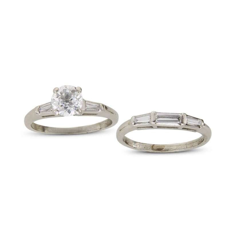 centering one old European-cut diamond, weighing approximately 0.80 carat, ring and band accented with baguette-cut diamonds.