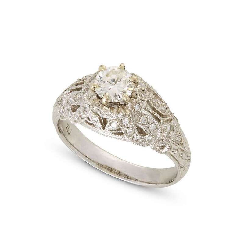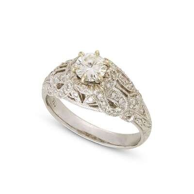 centering one round brilliant-cut diamond, weighing approximately 0.50 carat, accented by round brilliant-cut diamonds; estimated total remaining diamond weight: 0.30 carat.