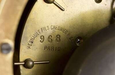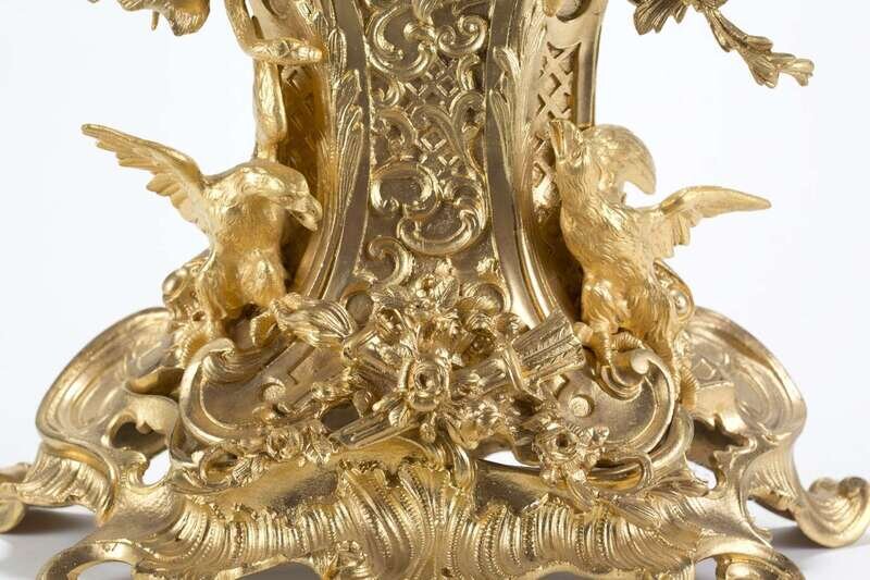 The white enameled face with Roman hours, Arabic minutes in beaded frame surmounted by a lion, c-scrolls, floral garlands, eagles and arrows at base, movement backplate marked, Regnault Fils Chesnier & Sarrazin, 968 Paris.