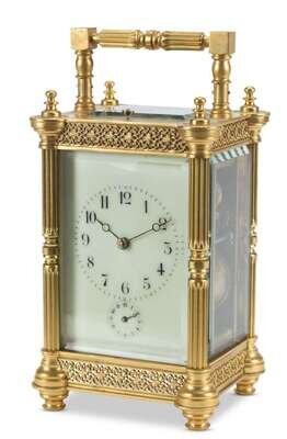 Rectangular case with reeded columns, finials and ornate borders, white enamel dial with subsidiary dial. .