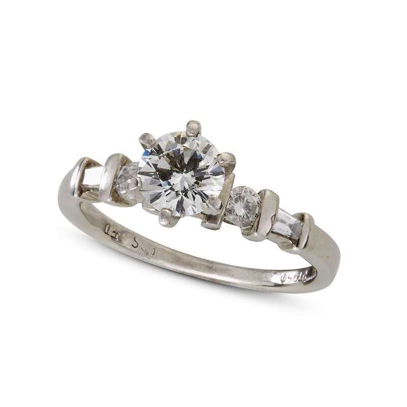 centering one round brilliant-cut diamond, weighing approximately 0.60 carat, flanked by round brilliant and baguette-cut diamonds.