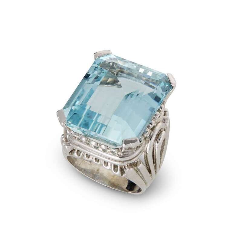 centering one emerald-cut aquamarine, weighing approximately 25.50 carats.