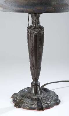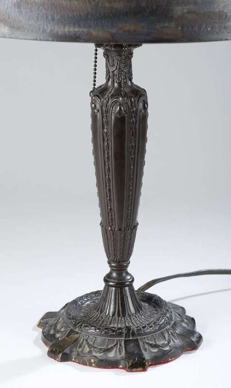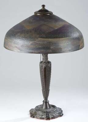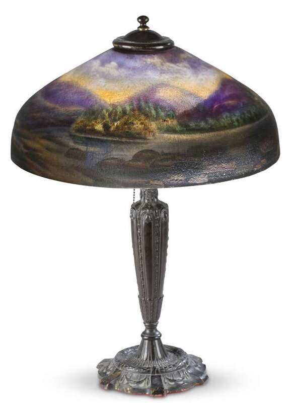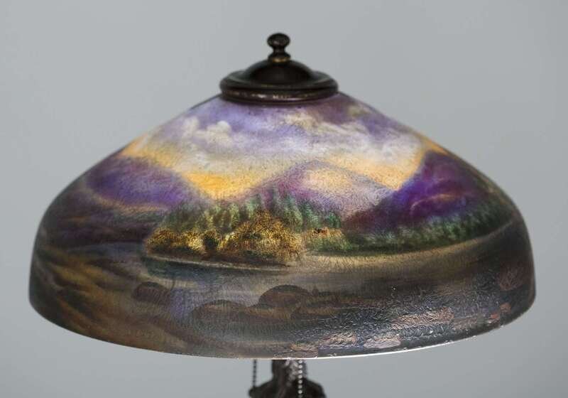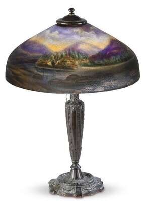 The chipped ice reverse hand-painted shade features the lakes of Killarney, dark brown patina bronze base.