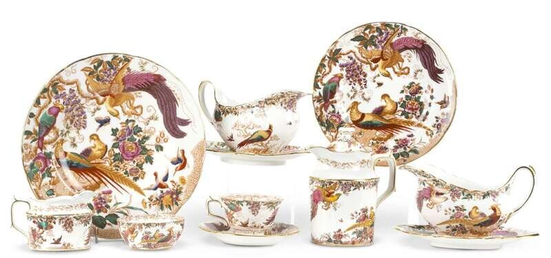 'Olde Asbury' pattern, transfer printed scene with phoenix in flowering trees, comprising of fourteen dinner plates, twelve luncheon plates, seventeen tea cups, seventeen saucers, two sauce boats with underplate (63).
