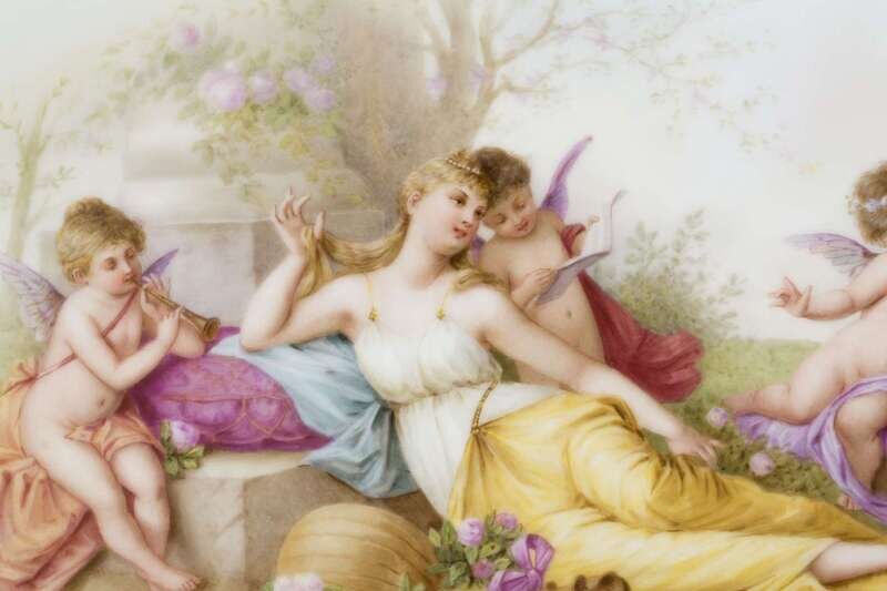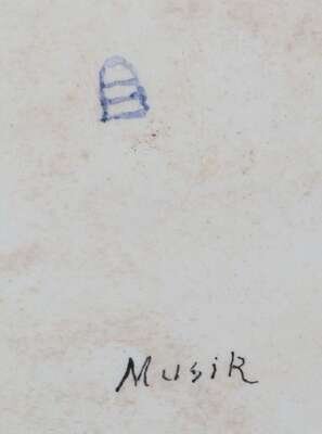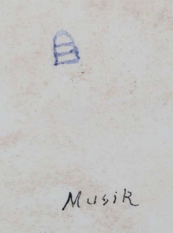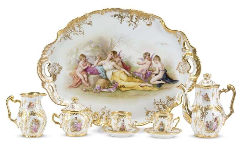 Signed Jäger, comprising of serving platter, teapot, creamer, covered sugar and two tea cups and saucers, hand-painted classical music scenes on each piece, underside of platter marked "Musik" and blue beehive mark. (6).