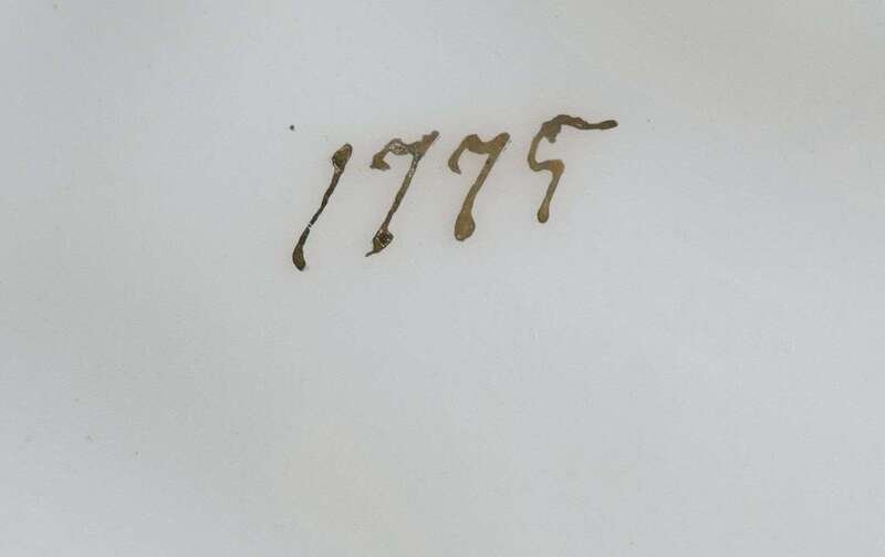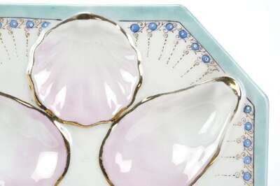 Each with blue rim, enclosing six pink oyster wells with gilt outline; underside marked 1779. (12).