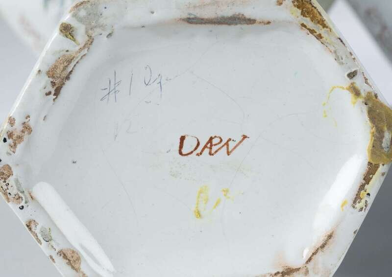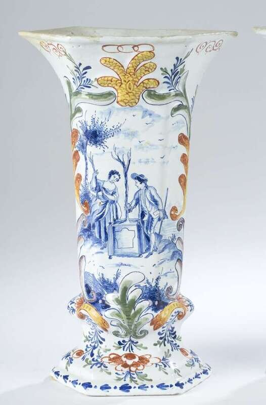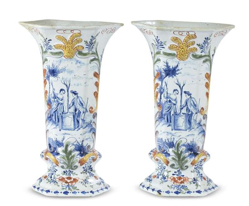 Polychrome vases with blue figural scene surrounded by floral decoration, mark of the De Paauw (Peacock) factory in blue glaze on underside. (2).