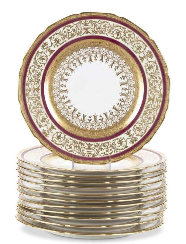 Red and gilt borders with bellflowers, scrolls and urns, marked "Limoges France" and "Warrin" (12).