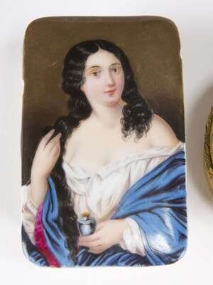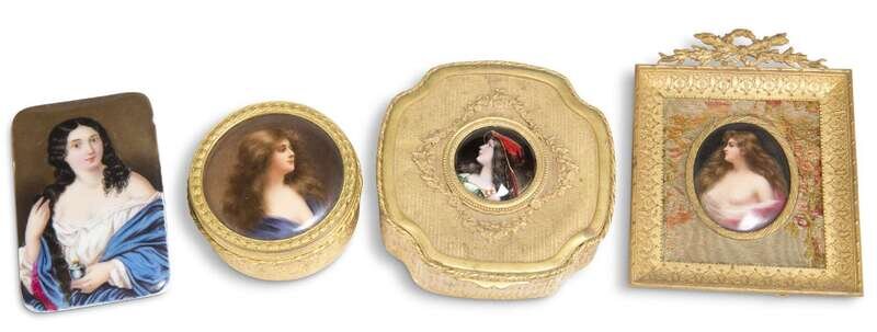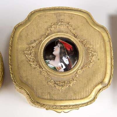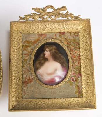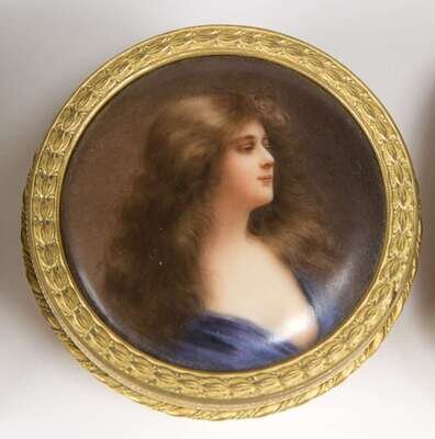 KPM style portrait dresser boxes, an oval semi-nude portrait plaque and small square portrait of a woman holding a jar. (4).