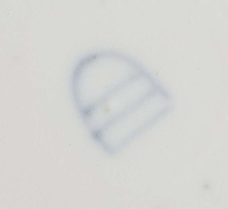 Hand-painted floral sprays with twisted green and white border between medallions, blue beehive in underglaze. (11).