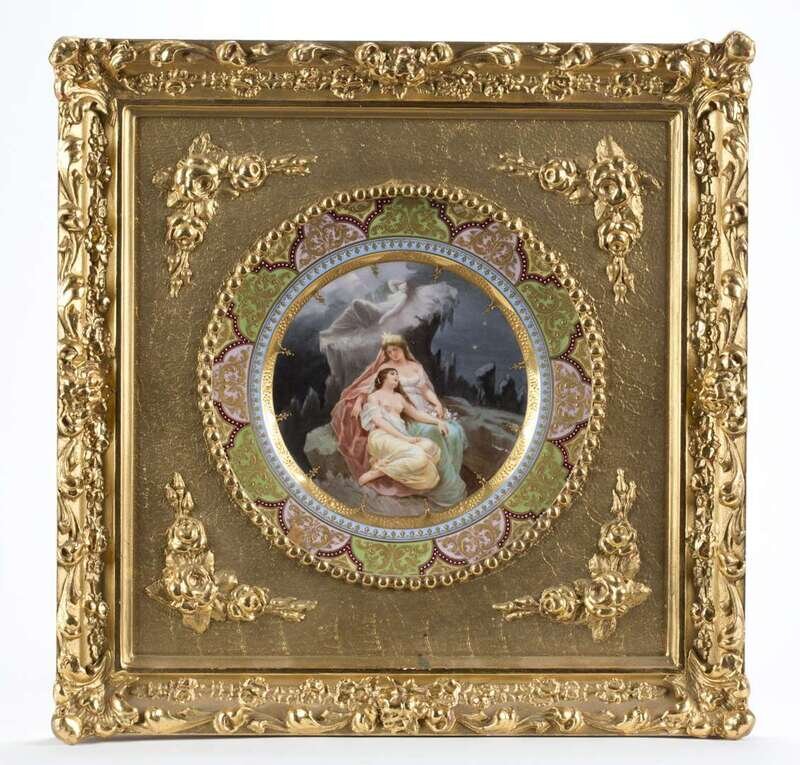 Depicting mythological scene, blue beehive underglaze mark to underside, placed in ornate gilt frame.