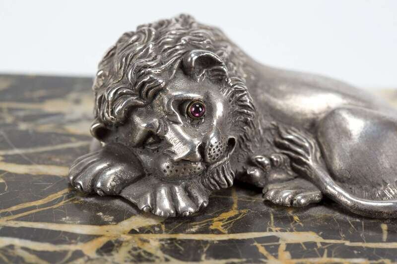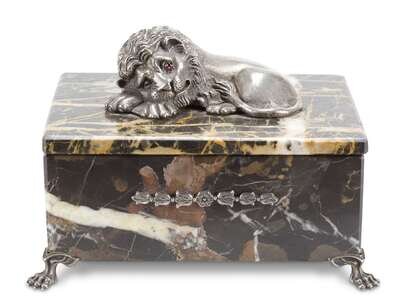 Silver lion mounted on stone box resting on paw feet.