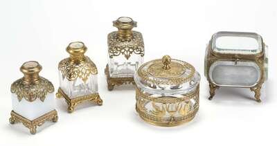 Comprising three brass mounted and footed crystal bottles with cap medallions depicting European scenes, round lidded crystal jar with ornate swan and urn brass overlay, footed brass crystal box. (5).