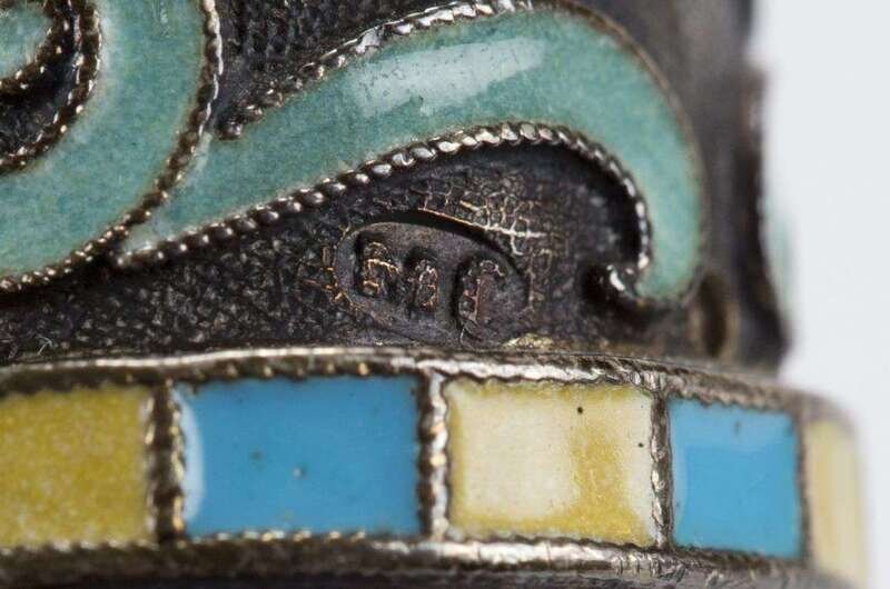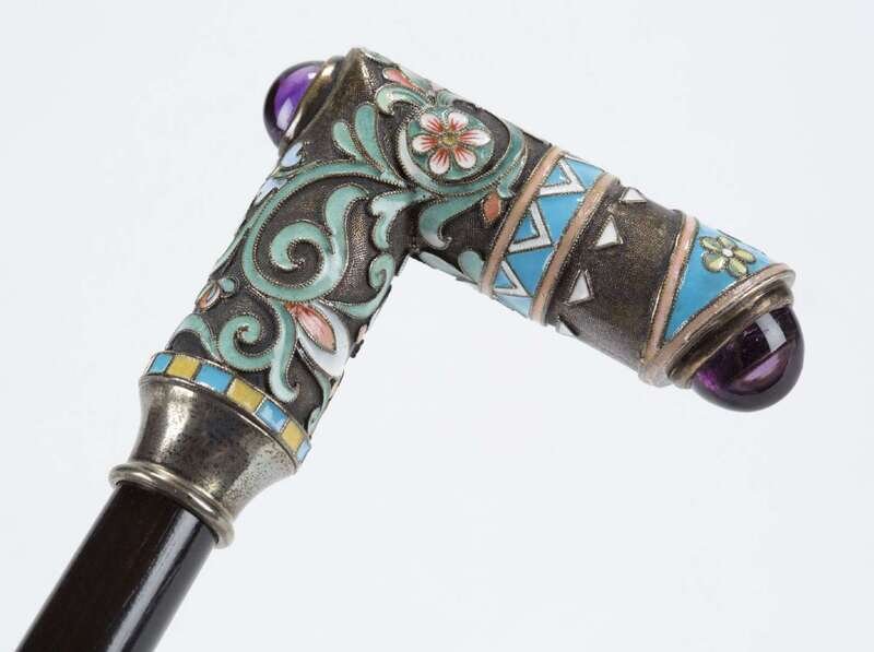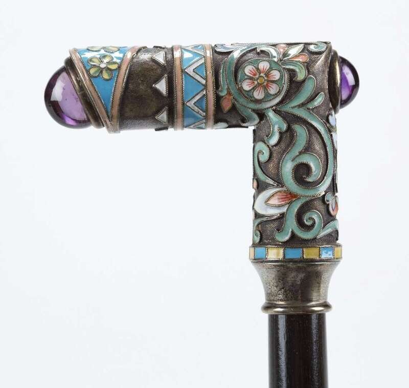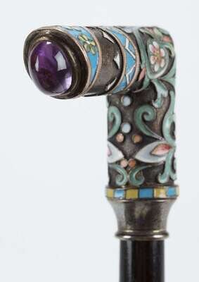 Bands of floral enamel and geometric borders, top of cane accented with amethyst at front and back, unidentified maker's mark.