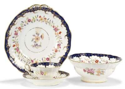 Cobalt blue border with gilt accents, floral medallions, comprising of 6 cups, 8 bowls, 2 serving plates, and 1 creamer (17).
