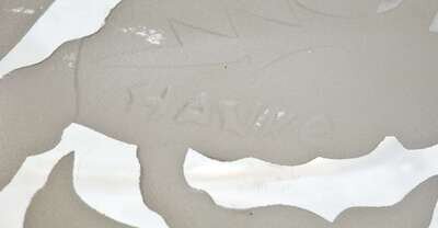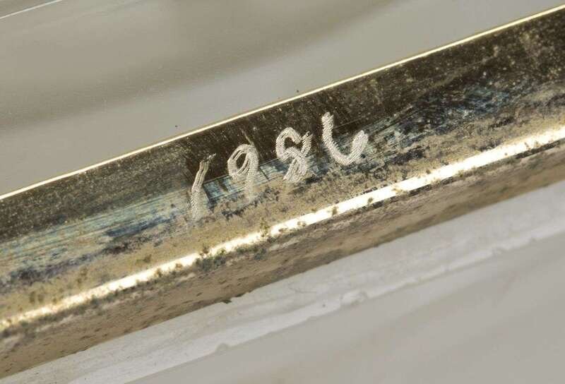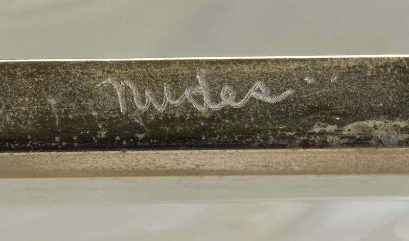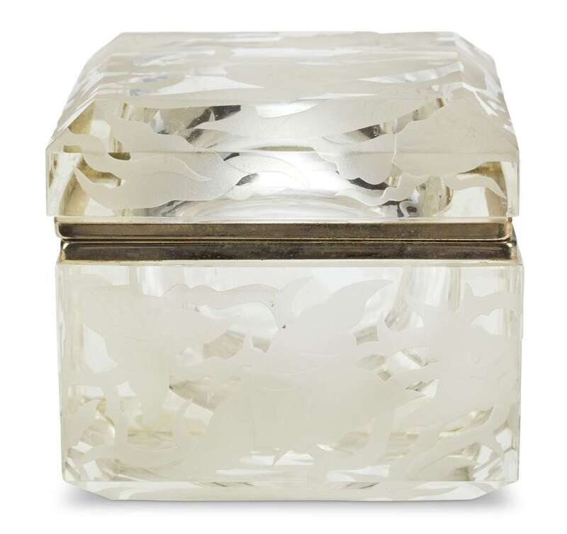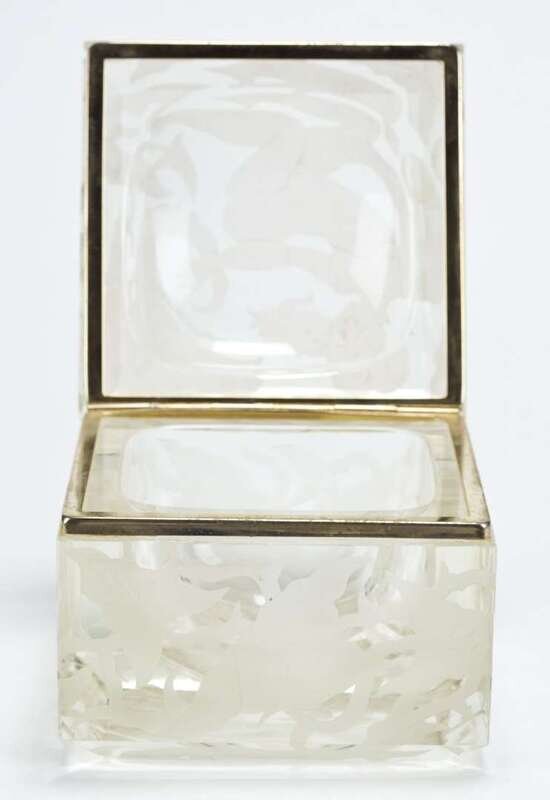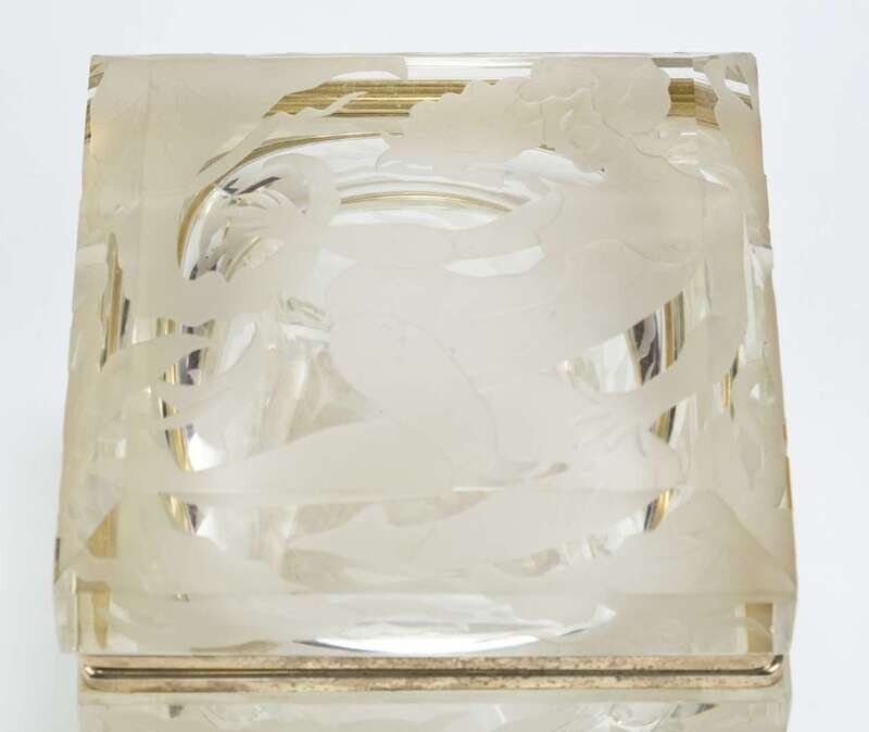 "Nudes", Signed "Hawke", Frosted crystal depicting nude female on lid, title and date etched in brass rim, impressed with signature on base.