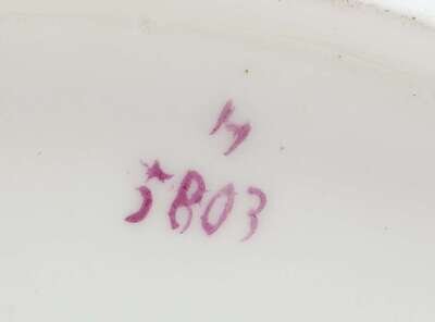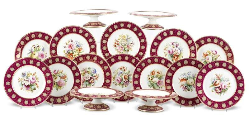 Central panel of floral bouquets with claret ground rim decorated with shells and vines, comprising of twelve plates and four tazzas, underside marked, "5803". (16).