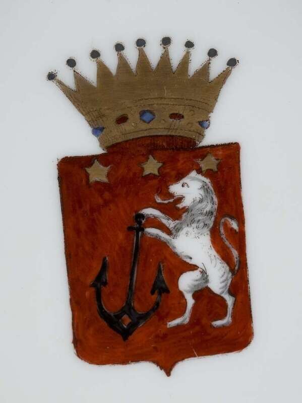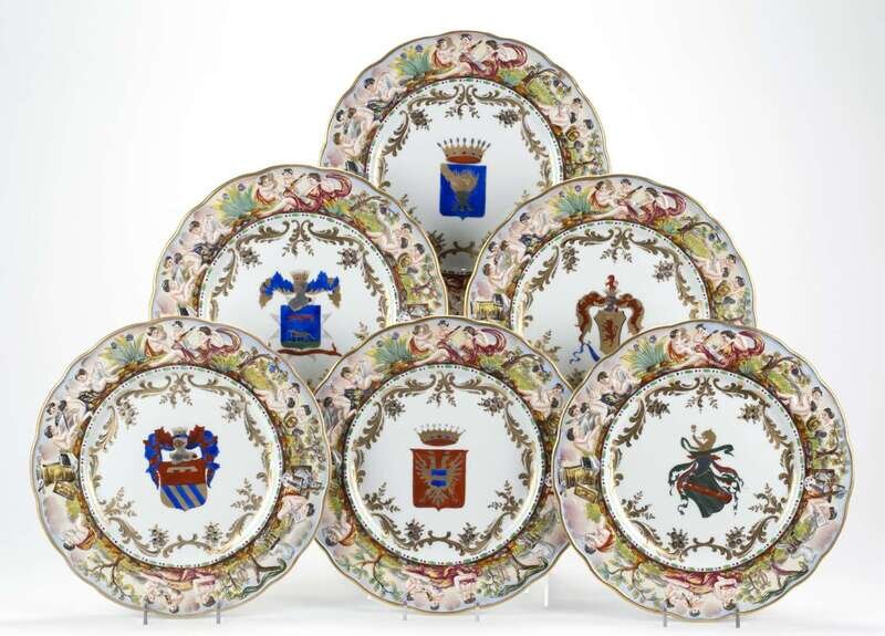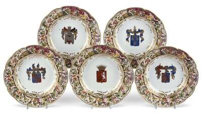 Comprising seven bowls and six dinner plates, the scalloped rim of each with raised neo-classical figures, the center reserve of each with a different coat of arms. (13).