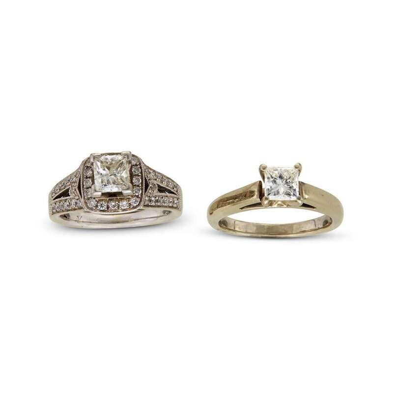 each centering one princess-cut diamond, weighing approximately 0.55 carat each, accented by round brilliant-cut diamonds; estimated total remaining diamond weight: 0.25 carat.