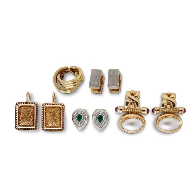 A collection of five pairs of gem-set, diamond, eighteen and fourteen karat gold earrings