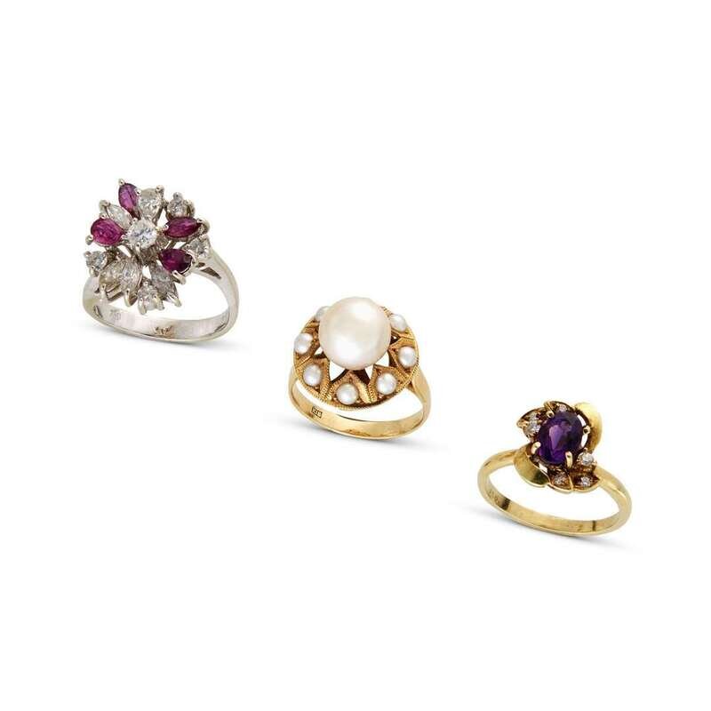 including one amethyst and diamond; one cultured pearl and one ruby and diamond; estimated total diamond weight: 0.90 carat.