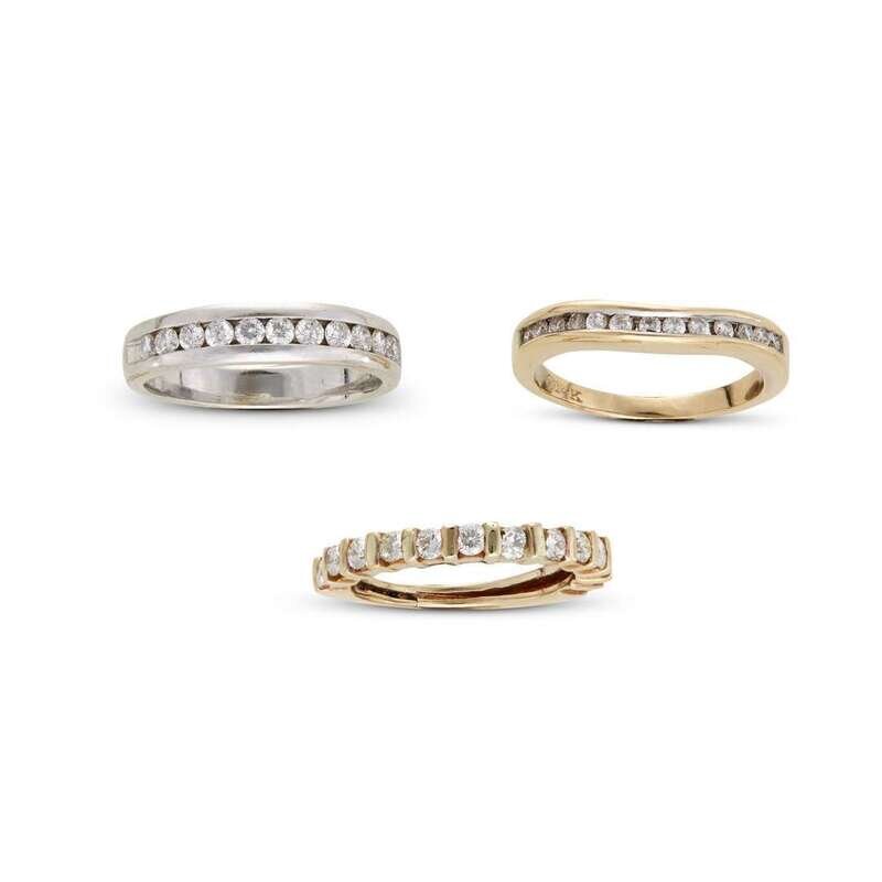 all three signed for fourteen karat and set with round brilliant-cut diamonds; estimated total diamond weight: 1.45 carats.
