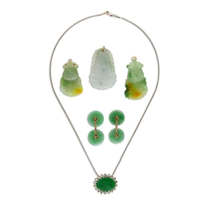including one pair of cuff links and four pendants, one pendant set with round brilliant-cut diamonds; estimated total diamond weight: 1.00 carat.