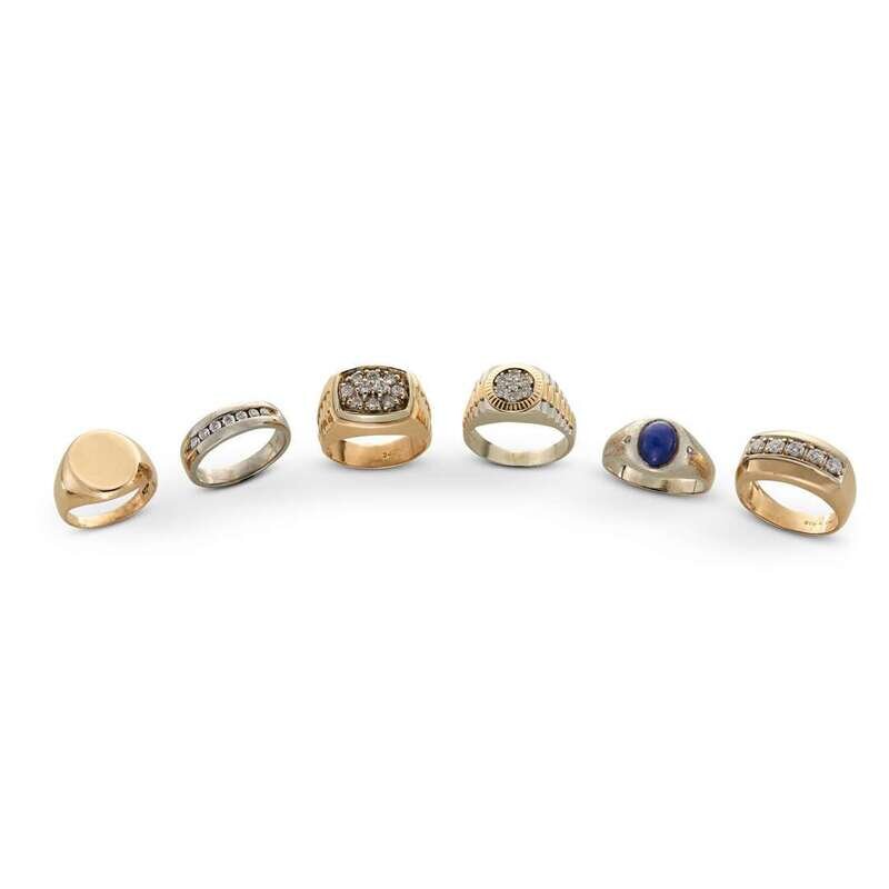 marked for platinum (1), fourteen karat (3) and ten karat (1) with one unmarked, one centering a synthetic star sapphire and all accented with round brilliant and two small single-cut diamonds; estimated total diamond weight: 2.55 carats.