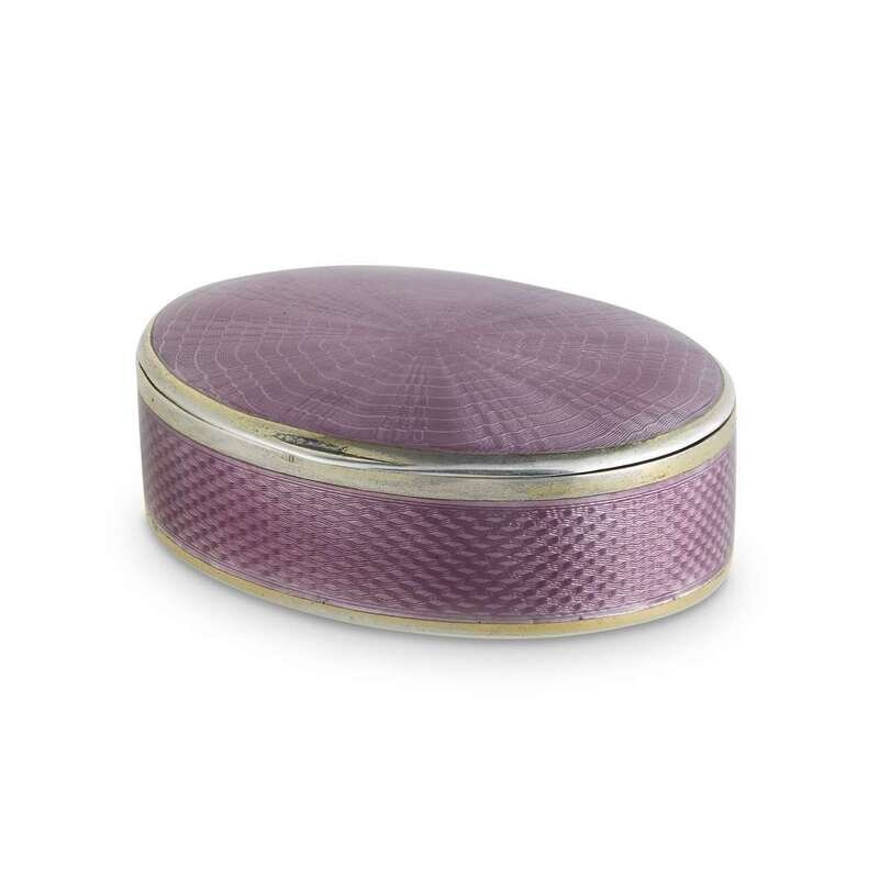 both guilloche, one oval shaped lavendar enamel, the other in yellow with a floral decoration outlined in blue enamel.
