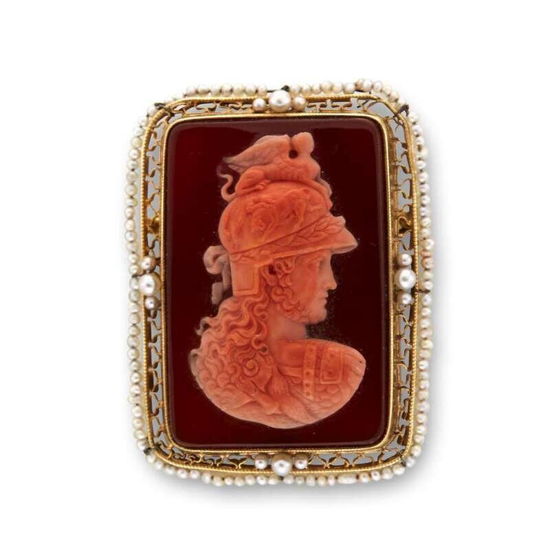 centering a carved carnelian cameo in a gold frame with seed pearl border.