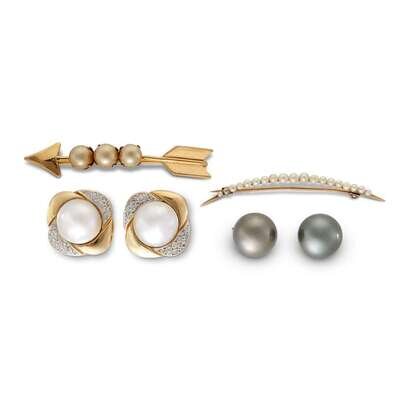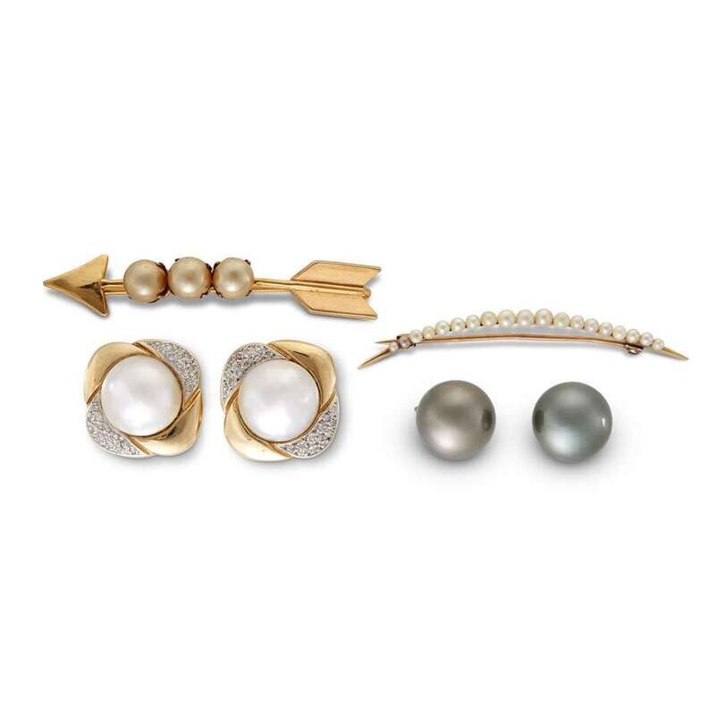 including two brooches and two pair of earrings. One pair of earrings set with mabé pearl and diamonds.