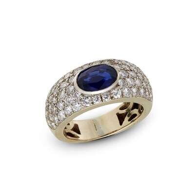 centering one oval sapphire; estimated to weigh: 2.00 carats and accented by round brilliant-cut diamonds; estimated total diamond weight: 1.70 carats.